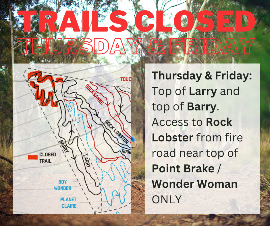 To keep as many trails open for as long as possible, and maintain access to Rock Lobster, the following trail closures will be in place.