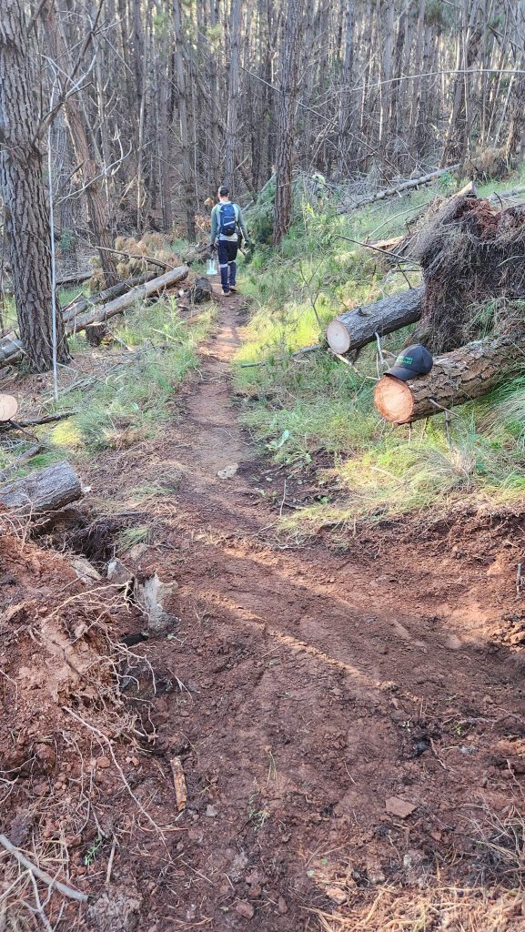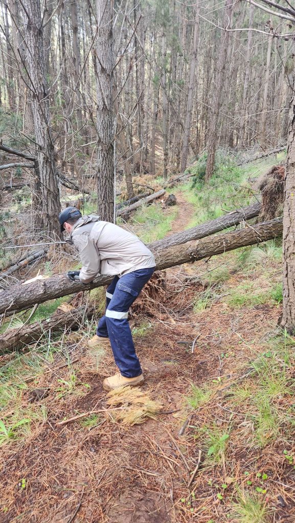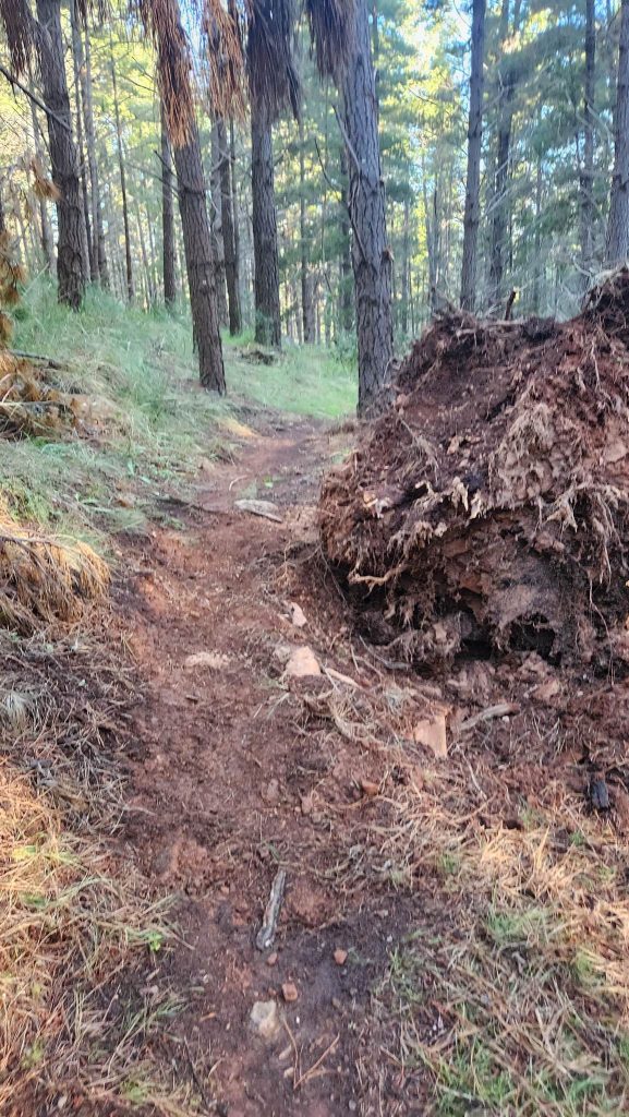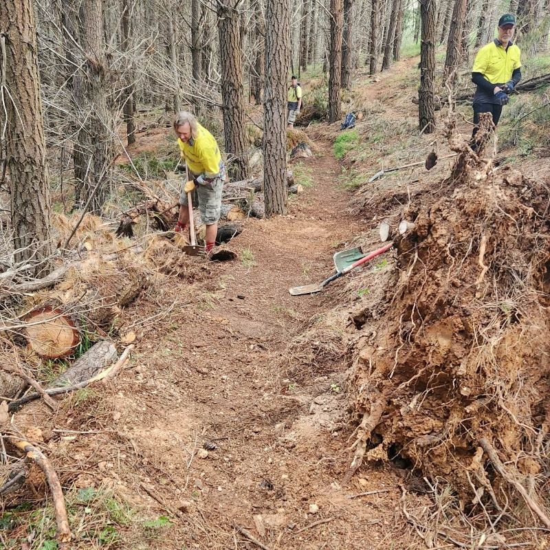 We concentrated our efforts on the trails in Swayze Gully which have been badly damaged by storms. A new diversion was raked in where a section of trail had become un-usable, more trees and branches cut, upturned root balls trimmed back and holes filled in, creek crossing rock armouring repaired and everything hit with the leaf blower.