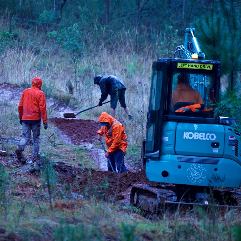 The morning started brightly when we met the legends from Iconic trails to unload the machine and bulk out the dirt for the Mama and Baby Bear re-shape. However on the stroke of 1pm just as the first of the volunteers arrived the rain set in. A solid crew of 16 or so still stuck at it in increasingly wet and cold conditions although the snow/sleet was a bit much. There is no better time to work on drainage than when it’s hosing it down!