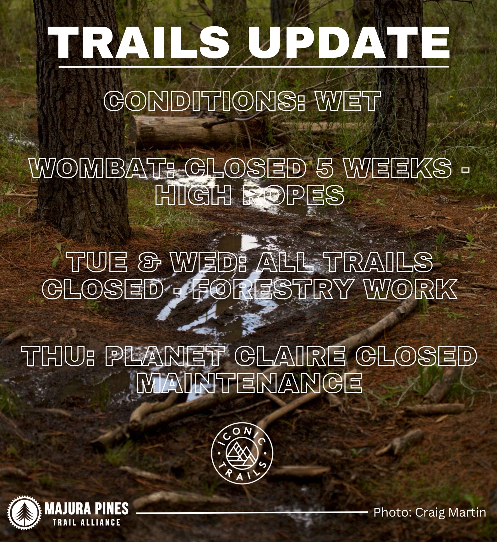 It’s really wet and muddy on all but the higher trails. Definitely avoid the XC trails and even winery hill needs more time to dry out.The Flash and pump track at the beginner area, Wombat, Radicle, Smitten Kitten and north ends of Cannery Row and Dew Drop Inn are all CLOSED because of mud and/or dangerous trees.